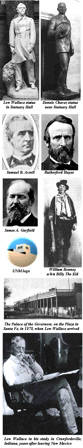 was appointed in mid-1878 by his fellow Republican, President Rutherford B. Hayes, who had been receiving reports about rampant lawlessness in the rapidly growing, 115,000-person territory. Among the accusations: homicidal gang feuding in Lincoln County—then covering a huge 25% of the entire state—plus open corruption and land fraud in Santa Fe. The incumbent governor, Samuel B. Axtell, a San Francisco lawyer and ex-Congressman, was considered part of the problem. Billy the Kid and law and order Wallace arrived in Santa Fe in September 1878. Not unlike our present governor, the main priority of Wallace upon taking office was law and order. He turned his attention toward the so-called Lincoln County War, pitting rival factions feuding over money, power and politics. The violence included murders of prominent citizens, rapes and theft. Wallace himself traveled to Lincoln in March 1879 to investigate the situation and find witnesses for the many pending criminal prosecutions. To get testimony, Wallace at one point negotiated personally with, and promised clemency to, a murderer named William Bonney, soon to become famous as the villainous Billy The Kid. Not surprisingly, the governor's deal with Bonney quickly collapsed. Eventually, after Bonney was convicted of murder, Wallace signed his death warrant and, when he escaped, ordered up the posse that shot The Kid dead in Fort Sumner in July 1881. Lincoln County quieted down somewhat. But New Mexico, then and now, is a pretty big place. Wallace had to contend with pervasive criminal violence in far-flung venues: Colfax County, Dona Ana County, Rio Arriba County. As historian Oakah L. Jones has written, Wallace spent a lot of time offering rewards, organizing citizen militias, finding funds for weapons, hiring special agents—and signing more death warrants. It is far from clear that his measures worked. As Gary Johnson would declare a century later, Wallace said in one report to Washington that the spiraling crime rate could be cut with--more prisons. He complained that the territory had escape-prone county jails and not a single state penitentiary. Again, similar to more recent times, convicted criminals were shipped to empty cells out-of-state, usually at the state prison in Nebraska. Then there was the problem with Indians—not over gambling and taxation, like today, but over an equally sensitive issue, control of their ancestral lands. Wallace received numerous petitions from New Mexicans seeking federal help to defend against Apache attacks. Here, Wallace was largely ineffective. The ``Santa Fe Ring’’ The condition of the territorial government was dreadful. The so-called ``Santa Fe Ring'' of bribe-taking office-holders and bribe-giving businessmen behind the scene was in full swing. Previous governors had discarded or even sold important papers documenting the state's history, especially papers related to important land grants. The 270-year-old Palace of the Governors was a leaky dump. The constant between then and now is the tension among the various branches of government. In 1880, Wallace found himself |